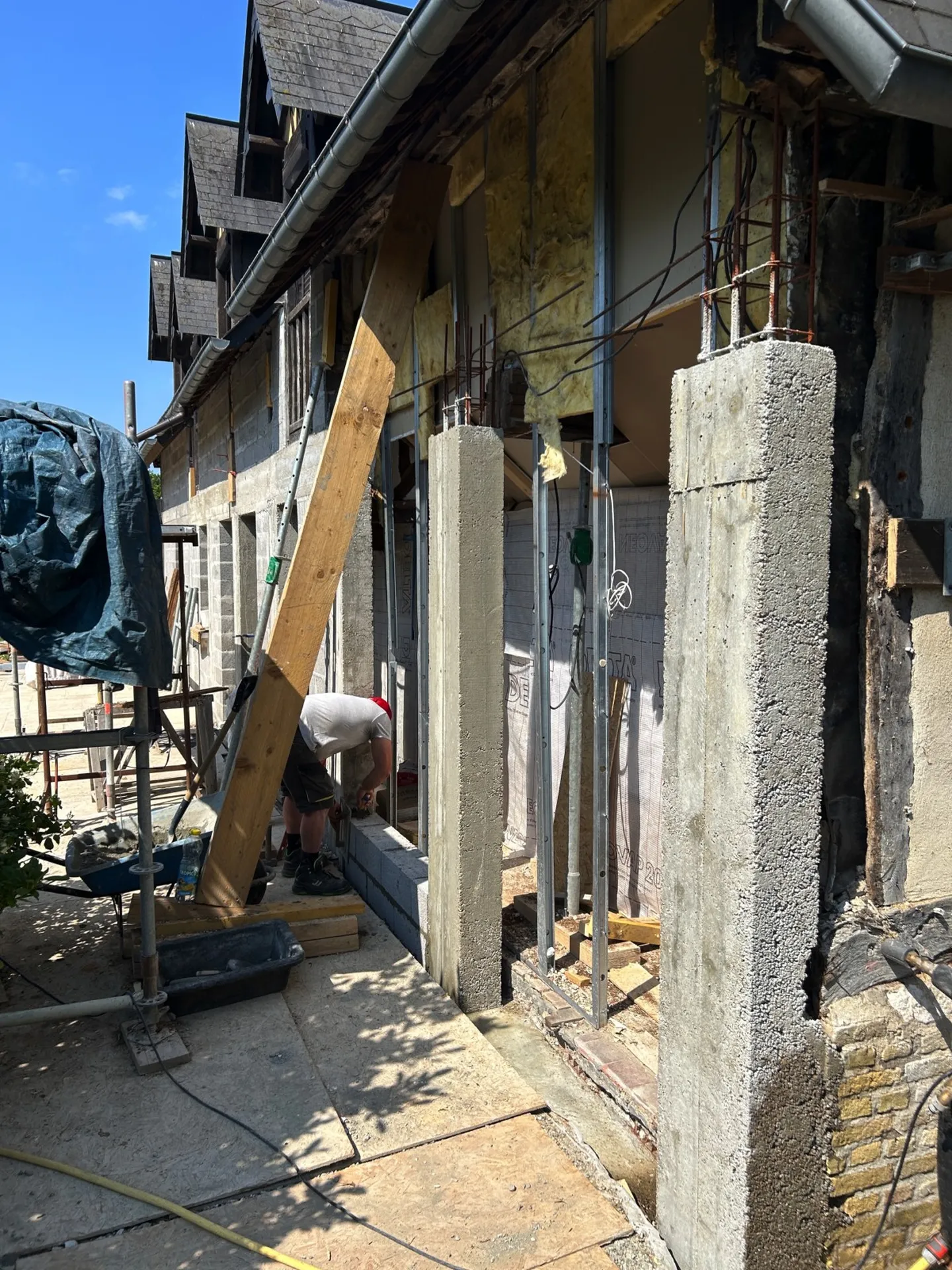 Notre client a fait appel à nos services pour la rénovation de la façade de sa maison normande. En effet, les colombages étaient en très mauvais état, et ont nécessité le remplacement total et à l'identique. Pour conserver l'état d'une maison normande, GMB a fait appel à des artisans spécialisés dans la rénovation selon une méthode traditionnelle, pour le remplacement à l'identique des colombages. Des travaux de démolition de l'existant ont été réalisés, pour ensuite appliquer l'enduit et poser les nouveaux colombages.
